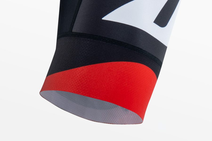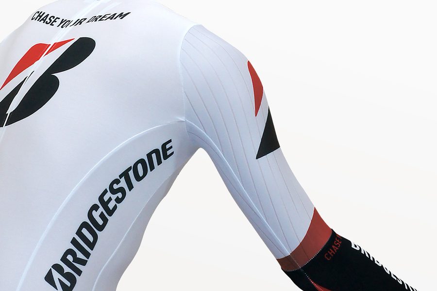 空力性能の向上を追求したタイムトライアル/トラック競技用のワンピースです。空気の乱れの原因となるファスナーを前面から省き、影響の少ない背面に配置。前傾姿勢に最適化されたコンパクトな形状は身体にしっかりとフィットするように設計され、着用皺を最低限に抑えました。低い姿勢をとった時に垂直に近い角度となることが多い上腕にのみ、エアロ効果が見込める「スピードライン1.3」を採用。生地特性を適切に引き出すことができるカッティングとなっています。また、直立姿勢の障害となるフロントファスナーがないことで競技中以外もストレスなく過ごせることもメリットの一つです。