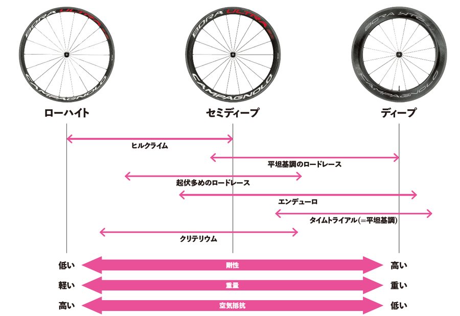 走行性能を大きく変えることができるホイール選びは、レース結果に大きく影響する。おもにリムハイトによって運用するレースシーンが分かれてくる。エンデューロやロードレースではエアロ効果の高いディープリムを選択しがちだが、横風の影響を受けやすく操縦性がシビアになったり、重量が重く登坂にパワーが必要になるなど、ネガティブな要素もある。ロードレースやクリテリウムでもリムハイトが低めのモデルのほうがバランスがよく、初心者にオススメだ。