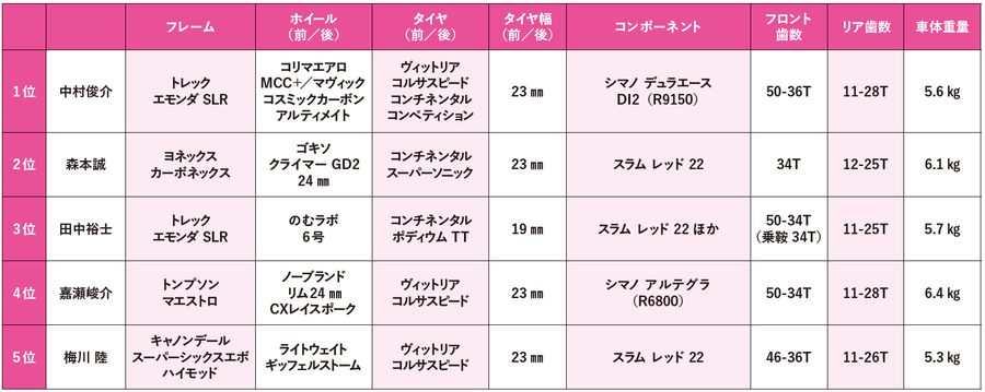 アマチュアトップレーサーたちは、機材に対して徹底したこだわりを見せる。市民ロードレースの最高峰「ツール・ド・おきなわ市民210km」と、ヒルクライムレースの最高峰「マウンテンサイクリングin乗鞍」で上位に入る選手たちの、リアルな機材カスタマイズは参考になる点が多い。彼らの機材を参考にしながら、自身に合った機材を作り上げるのもレースに参加する楽しみでもある。