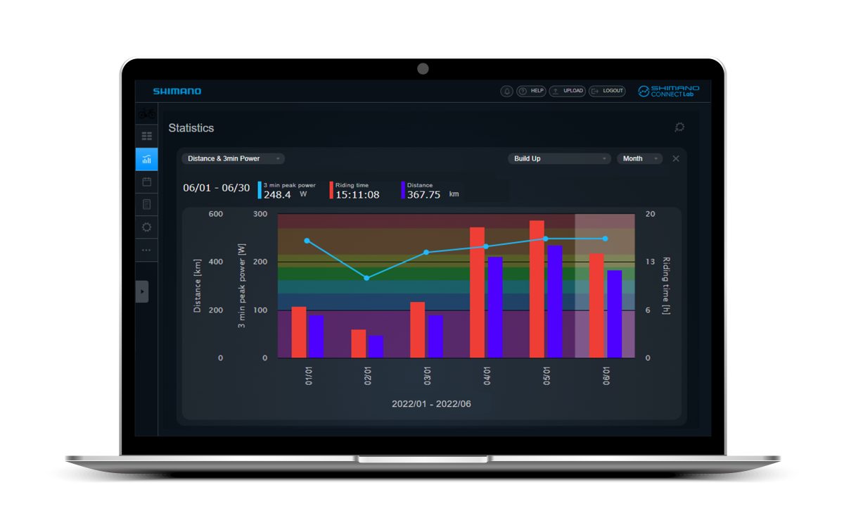 ガーミンやワフーのサイクルコンピューターに記録されたライドデータには、ライド全体のペダリングデータが記録されている。このデータをシマノコネクトラボにアップロードすることで、ライド全体のペダリングデータをライド後に振り返ることができる。