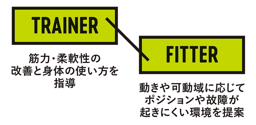 このようにフィッターとトレーナーで専門分野は異なる。今回、アドバイスしてもらうサンメリットの伏見真希門さんはフィッターであり、バイクフィットなどの補正器具を駆使してアライメントを整えていくプロフェッショナルだ。