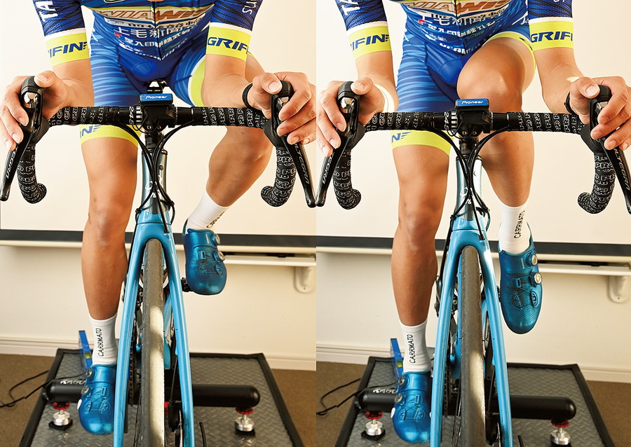 チェックポイントは、ヒザの位置が左右にブレていないかどうか。ペダリング運動は、正面から見たとき、脚の上下運動になっており、違和感なく垂直にヒザが上下できているのが理想。逆に軌道が定まらずブレているようなら補正が必要。ブレはヒザが上死点を通過するときと、踏み込む力がもっとも強くなる4時間前後で起きやすい。姿見など大きめの鏡があれば、ペダリングをセルフチェックできる。