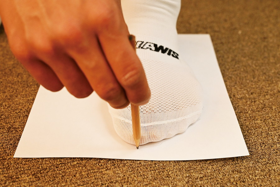 白い紙と鉛筆を用意して、紙の上に真上から足を置いて程度な圧をかける。その状態から周囲をなぞるようにラインを引いていく。ある程度ラインを引けば、全周引かなくてもサイズを把握できる。