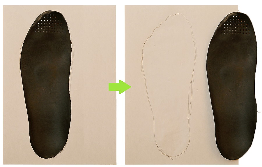 シューズの中からインソールを抜き、ラインに合わせて重ねてみよう。実際の足の縦の長さや足幅がピッタリと重なるかどうかをチェック。シューズが大きすぎる場合は、重ねたインソールでラインが隠れてしまう。逆はシューズが小さいか、幅が狭いことがわかる。