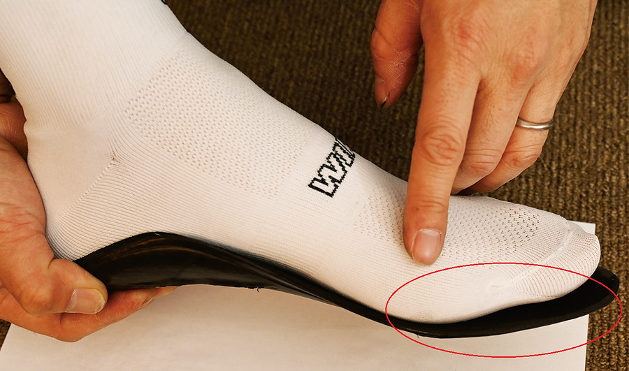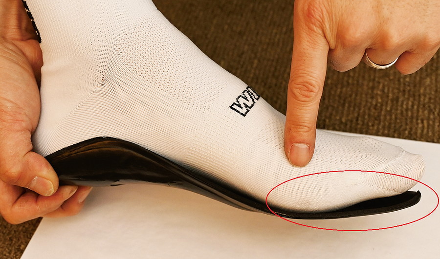 サイズが合っていないと、アーチ部がズレてシューズの中で足が不安定になる。シューズが大きすぎる場合は、つま先下にスペースができてしまいペダリングのたびに指先が遊んでしまう。