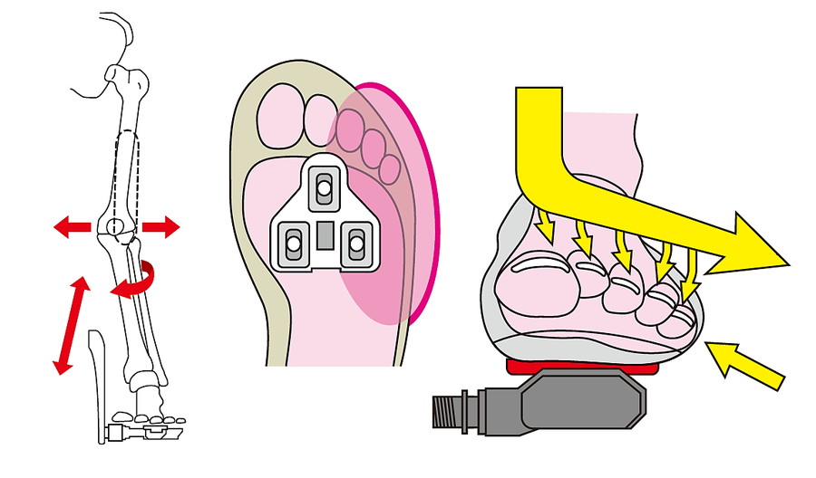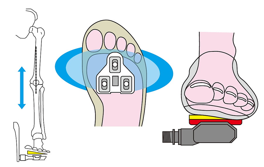 足首自体が内反していると、ペダリングで踏み込むたびに、足の外側に力がかかりやすくなる。シューズ自体はクリートで固定されるため、ウェッジで角度を付けなくても水平になるが、内反した足はシューズの中で不安定になり、全体的に外側へ力が加わりだす。この結果、長時間のライドで足裏へ局所的な圧がかかりやすく足裏に痛みが発生してしまう。このとき、ヒザも左右へぶれ、ヒザ下にはねじれが起きてペダルに対してまっすぐ力を加えにくい。