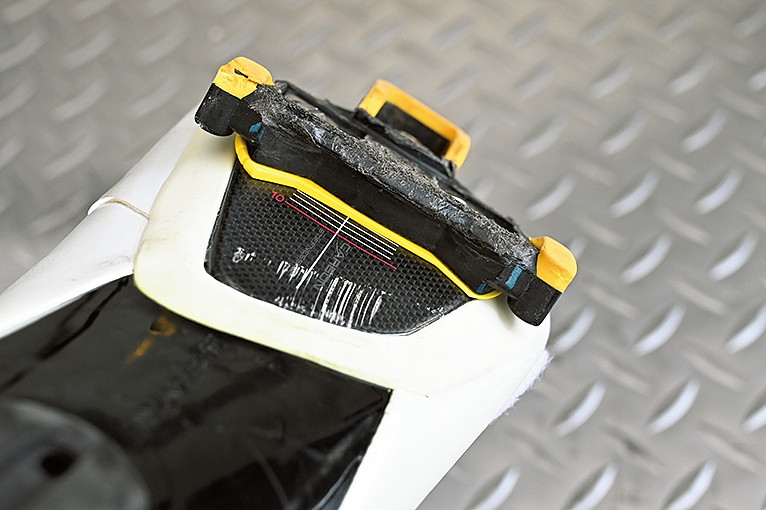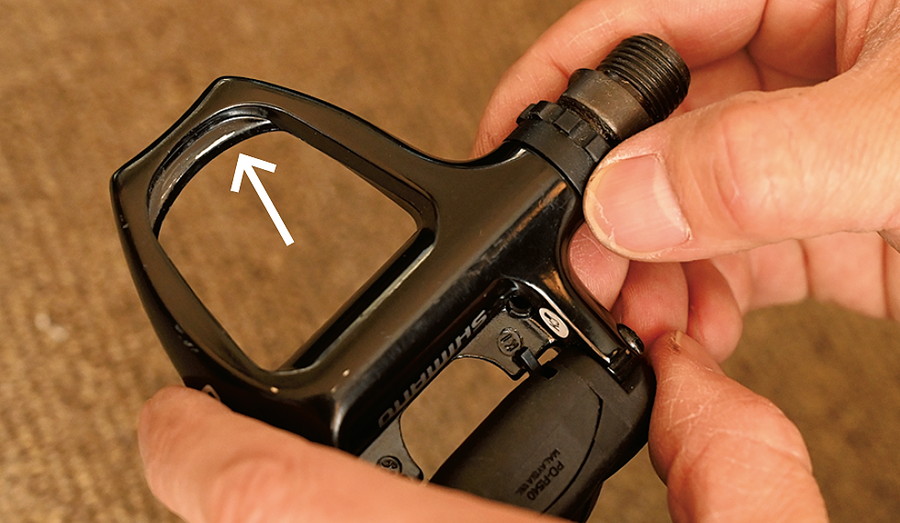 ヒザに痛みが起きやすい人の多くは、今すぐにビンディングペダルの先端の削れ具合をチェックしてみよう。O脚が多い日本人は足が内側へ向きやすく、ペダルの内側(フレーム側)にキズがつきやすい。そのため、クリートウェッジで足首の角度を補正することで足を安定させることができる。