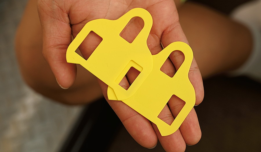 シューズとクリートの間にクリートウェッジを入れることで足の内反や外反を補正でき、ヒザが左右にブレないシンプルな垂直軌道のペダリングができるようになる。バイクフィットのクリートウェッジは1枚で1度の角度をつけられる。クリートタイプに合わせて2つ穴用、3つ穴用、4つ穴用が用意されている。