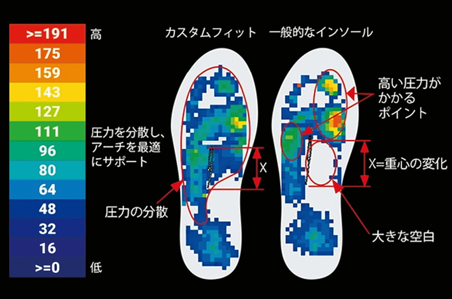 ノーマルインソール(右)と高機能インソール(左)を比較したときの圧力分布の違いを示している。高機能インソールのほうが、局所的な圧力が消え、踏み面も増えていることがわかる(画像データはシマノホームページより)
