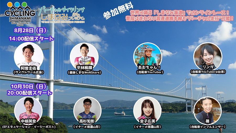 10月30日に開催される国際サイクリング大会「サイクリングしまなみ」のコースの一部を自宅にいながら走れるバーチャルサイクリングイベントが、8月28日(日)と10月30日(日)にオンライン上で開催される。イベントにはプロ選手や自転車YouTuberがゲストとして参加。普段は走れない高速道路本線も、バーチャル走行が可能だ。以下、プレスリリースより。