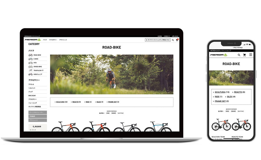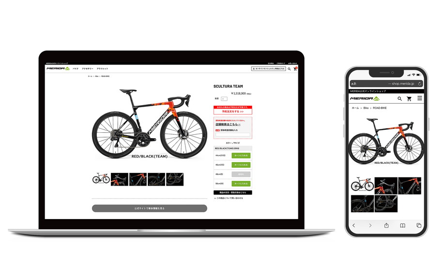 ラインアップを多く取りそろえている MERIDA バイク。お客さまがお求めの商品を「みつけやすく」なるようにカテゴリー表示を細分化、そして商品が「見やすく」なるように写真の表示方法、スマートフォン対応へと大幅にリニューアルしたことにより「みつけやすく」、「見やすく」なり、お客さまが快適にお買い物をしていただけるようになりました。さらに在庫の有無が一目でわかるようになったため、お求めの商品をよりご注文、ご予約がしやすい新たなデザインにリニューアルいたしました。(※予約注文は自転車販売に限ります。)