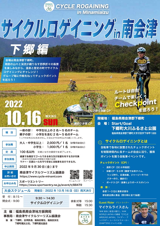 10月16日(日)に、福島県南会津郡下郷町で「サイクルロゲイニングIN南会津」が開催される。自転車でスタート地点から各地に設けられたチェックポイントを制限時間内で自由に周り、ゴールするまでに獲得したポイントを競う自転車イベントだ。エントリーは9月30日まで。以下、プレスリリースより。