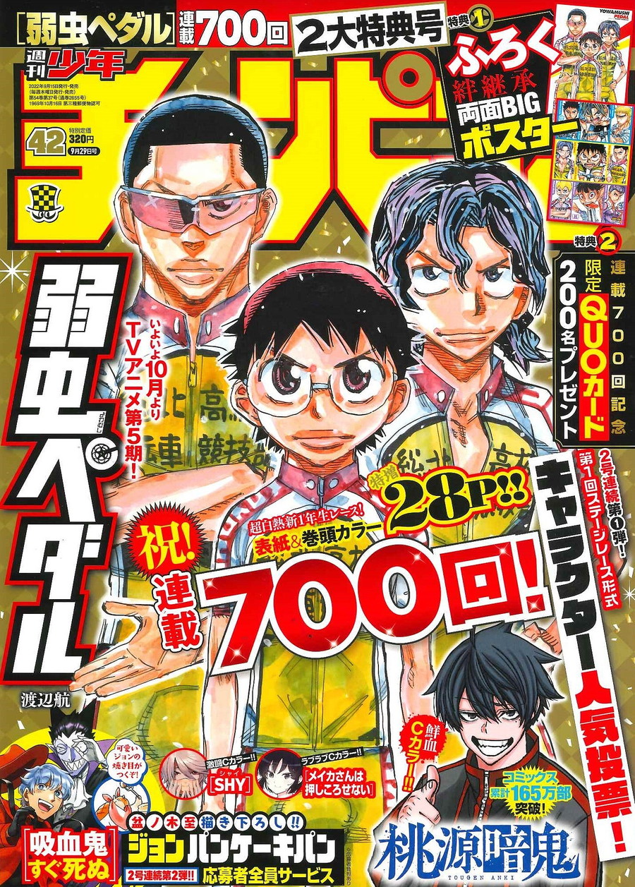 株式会社秋田書店が発行している週刊少年漫画誌『週刊少年チャンピオン』(編集長:武川新吾)9月15日(木)発売の42号の表紙&巻頭カラーに、連載700回を迎える大人気自転車ロードレースコミック「弱虫ペダル」が選ばれた。