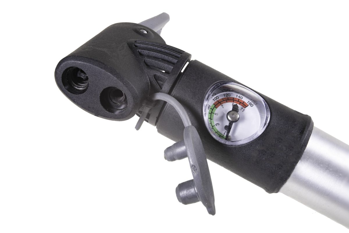 仏式と英式に対応した、差し込むだけのワンタッチポンプを採用し、携帯ポンプには珍しい空気圧計を装備しています。折り畳み式のベース付きなので、本体を地面に着けてフロアポンプのように使うことができます。フレーム取り付け用のブラケットが付属します。