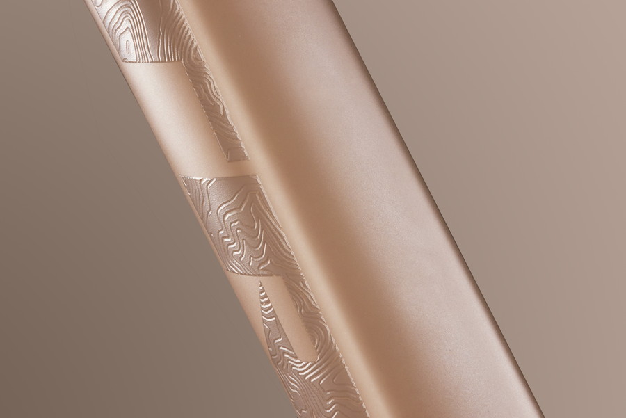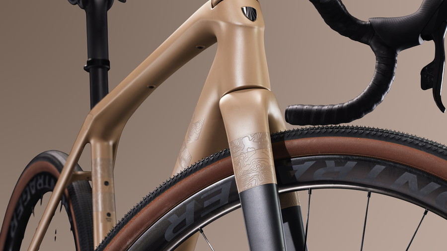 グラベルロードバイク「Checkpoint(チェックポイント)」用のカスタムカラー、Driftlessは、冒険への気持ちを高めてくれるデザートカラーに、地形図をモチーフにしたトレックロゴを採用。
