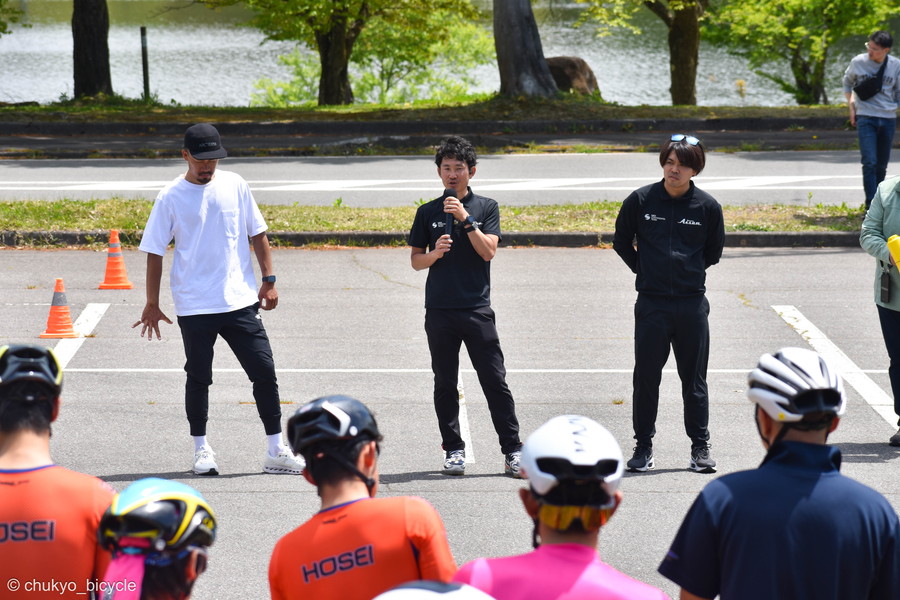 学生シリーズ戦のタイムトライアルレースを挟み、午後の部は交通規制がされているレースコースを使って3人以上の並列走を組み込んだ集団走行の実技指導を実施。
