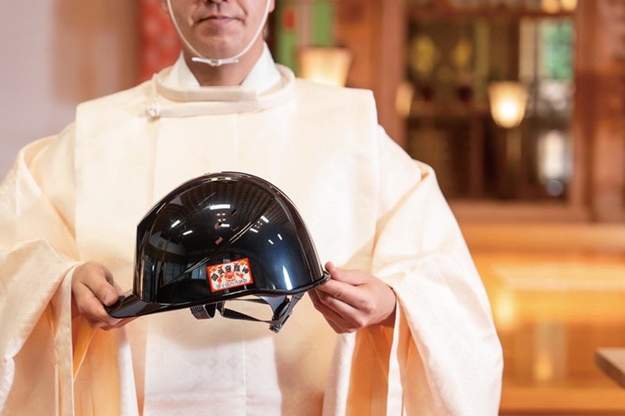 神社では趣味から日常用途の自転車・バイク用ヘルメットだけでなく、工事用ヘルメットなど危険を伴う仕事用ヘルメットの安全祈願も行っている。