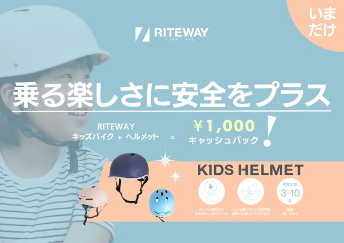 RITEWAYのキッズバイクZITシリーズと、このキッズヘルメットを同時にご購入頂くと1000円キャッシュバック! キャンペーン実施期間は2023年8月から12月20日まで。
