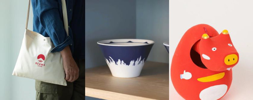 BEAMS JAPANクリエイティブディレクター鈴木修司が日本全国のさまざまな人や産地を巡って取りそろえた銘品を各都道府県ごとに紹介した書籍「ビームス ジャパン 銘品のススメ」。福島県 野沢民芸の別注赤べこなど、その書籍に掲載している一部アイテムや、オープンより人気を博しているBEAMS JAPANのロゴを配したオリジナルアイテム、器全体で富士を表現した丼鉢などの富士山モチーフアイテム、キャンプやアクティビティですぐに使用できるタオルなどを取りそろえます。