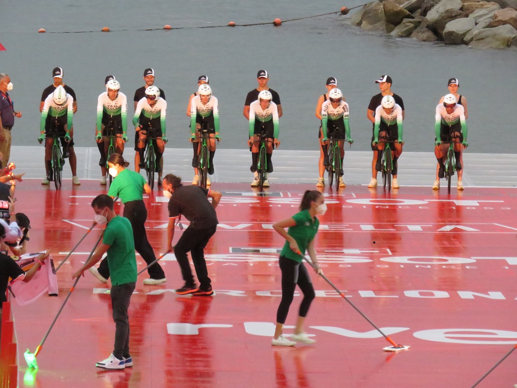 午後3時くらいから各チームがタイムトライアルのコースの試走を始めるが、この時点では空には雲が多いものの雨が降る様子はなく、選手たちも比較的過ごしやすい気温の中でのコース試走となった。特に、DSMファ―ミニックやイネオス・グレナディアーズそしてモビスターが第1ステージ直前に2回の試走をしていたのが目を引いていた。