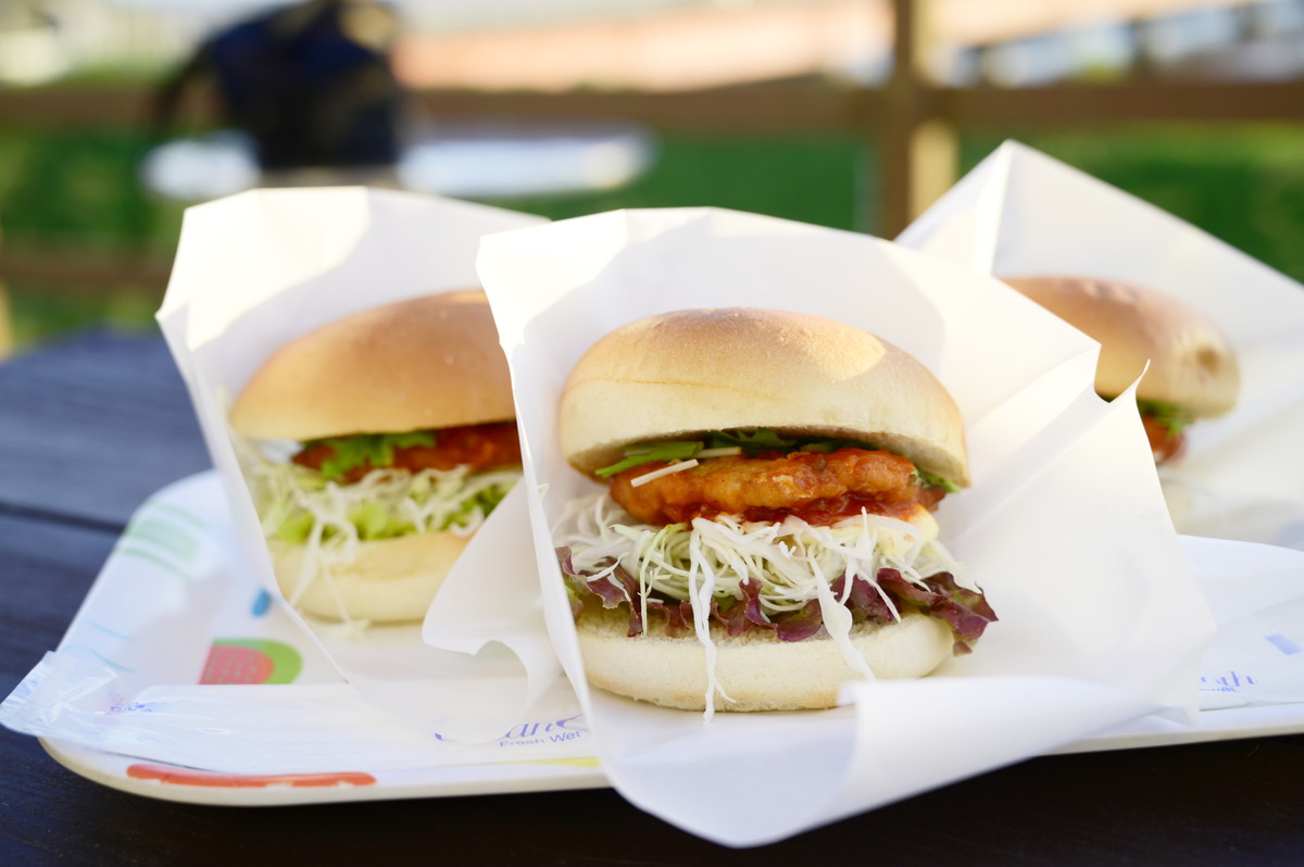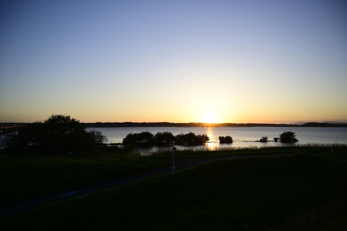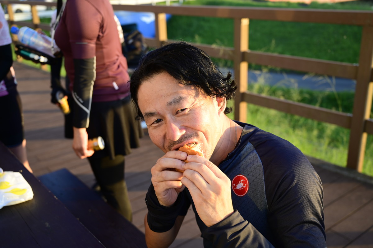 最後の休憩ポイント、道の駅たまつくりに到着。ここではスタッフが先回りして注文しておいてくれた、なめパックンを食べる。これはここ行方市のご当地バーガーで、なめパックンは霞ヶ浦でとれるナマズ肉のハンバーガー。ほかにも「かもパックン」(鴨肉)、「こいパックン」(鯉肉)などのバリエーションがある。時刻は日暮れ時。霞ヶ浦に沈む夕日がキレイ……なんて言ってる場合ではないのでは? まだ20km以上ありますが!?