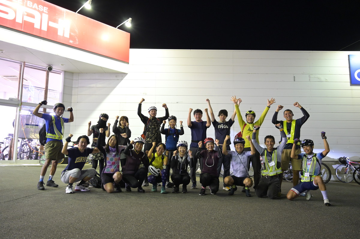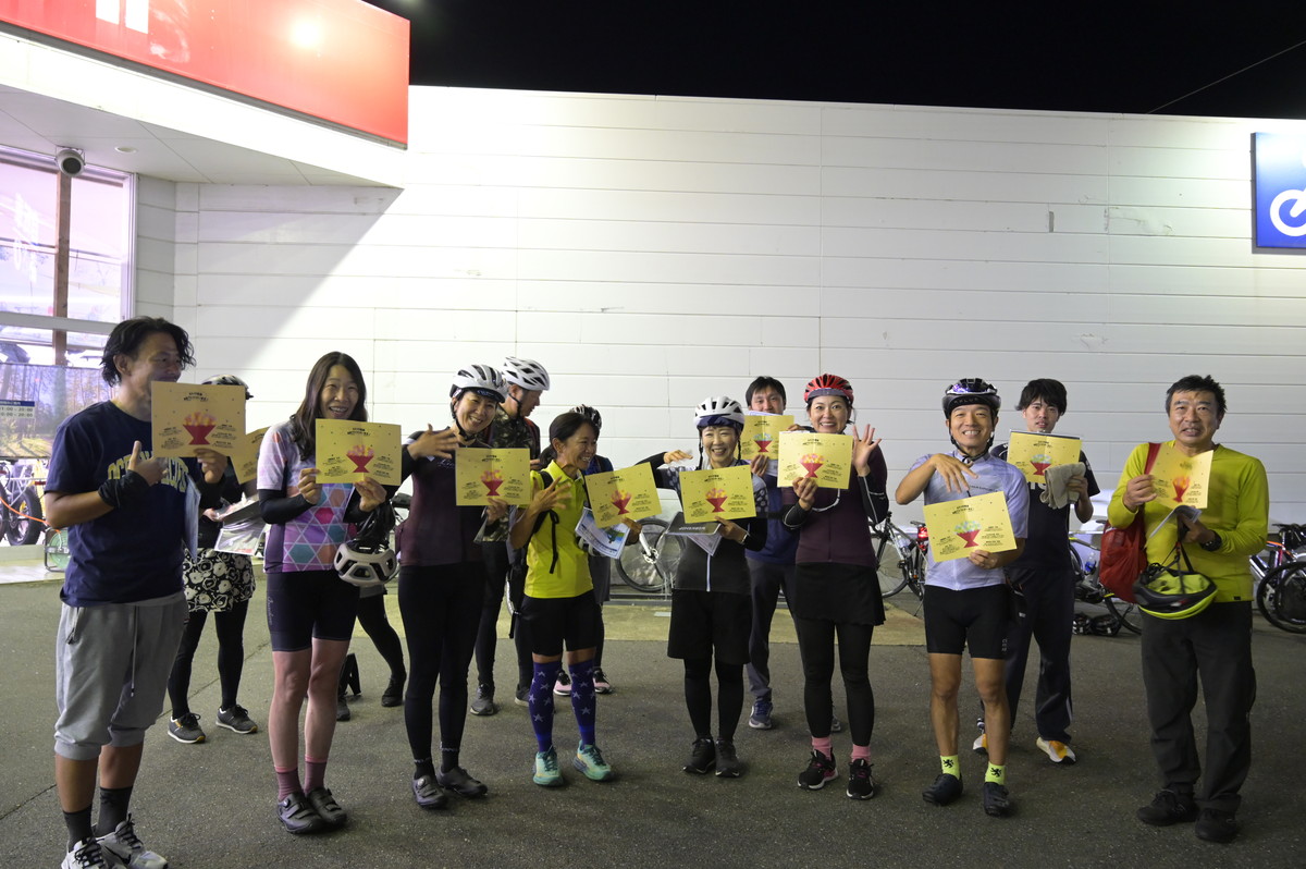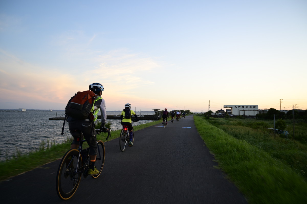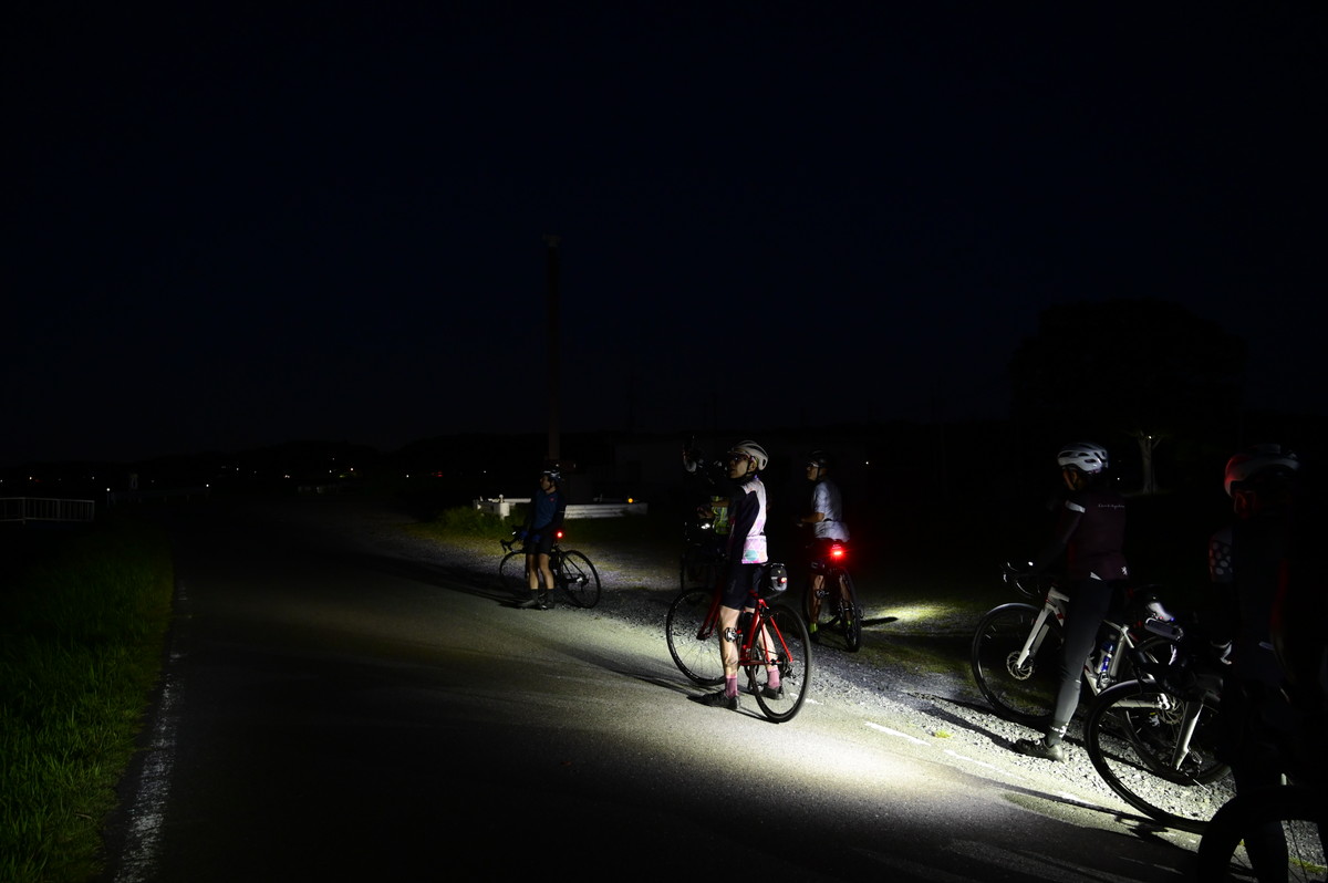 すっかり日が暮れた18時半。追い風の闇の中をびゅんびゅん飛ばす。街灯なんてものはないので、みんなのライトが頼りだ。ライドの一体感が増す。ガイドが先頭を守ってくれるから安心して走れる。「一人だったら怖くて走れないかもー」