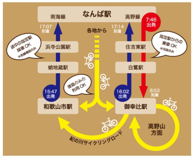 往路は、高野線(難波駅→御幸辻駅)でサイクルトレインに乗車し、和歌山市駅までの紀の川沿いコースや高野山内コースなどでサイクリングを楽しんだ後、復路の南海線(和歌山市駅→難波駅)または高野線(御幸辻駅→難波駅)でサイクルトレインに乗り大阪にお帰りいただけます。