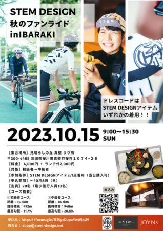 カジュアルなサイクルジャージや小物ウエアを生み出すSTEMDESIGN(ステムデザイン)が、10月15日に茨城でファンライドイベントを開催する。以下リリースより。