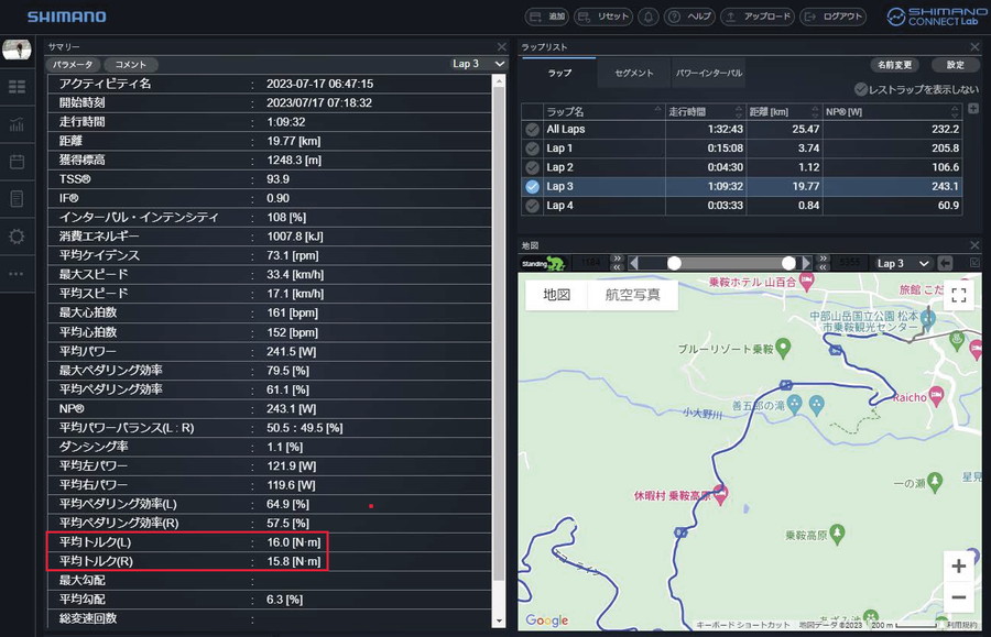 乗鞍の試走時の1時間09分34秒のデータ。シマノコネクトラボは、シマノパワーメーターのようなトルクを測れる機器と組み合わせると、トルクも表示される。自分がどのようなペダリングでパワーを生み出しているか(軽めのギヤを速く回してパワーを生み出す出すor重めのギヤをゆっくり回してパワーを生み出す)などがわかる