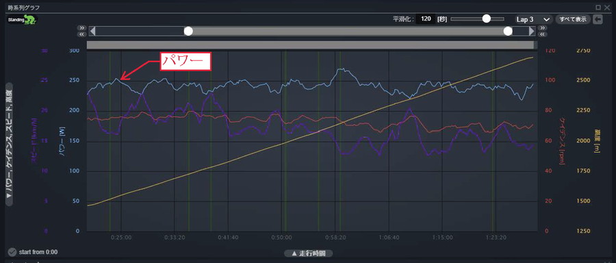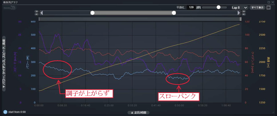 「僕のデータでよければ」と、ご提供いただいた乗鞍当日の時系列グラフ。序盤の入り方の様子やスローパンクによるパワーの低下の様子などが見てとれる