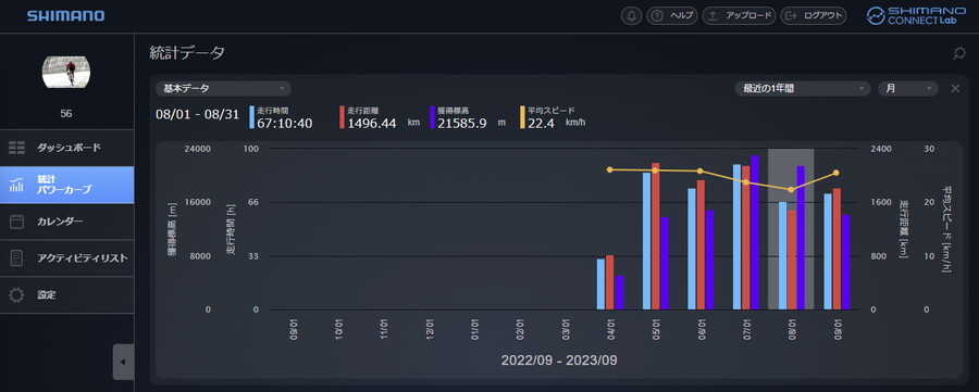1年間の走行時間、走行距離、獲得標高などのデータ。シマノコネクトラボの場合は画面左にある「統計パワーカーブ」から呼び出せる(五郎さんは4月から利用し始めたので、それ以前のデータはなし)