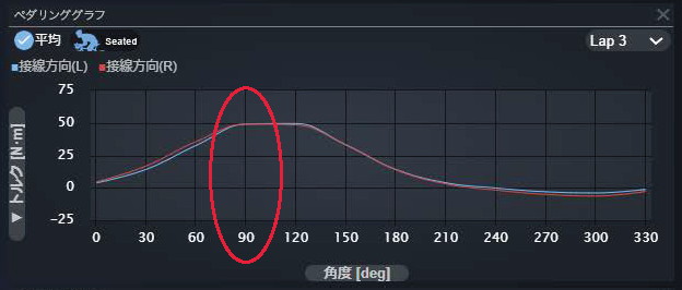 自身のペダルの踏み方がわかる指標の一つがペダリンググラフ。五郎さんは90度(クランク3時の位置)でトルクがかかっている。ペダリングの効率がいい(写真赤丸)。ペダルを踏み遅れている人は、トルクカーブの頂点が90度ではなく120度(下死点)に近づいていく
