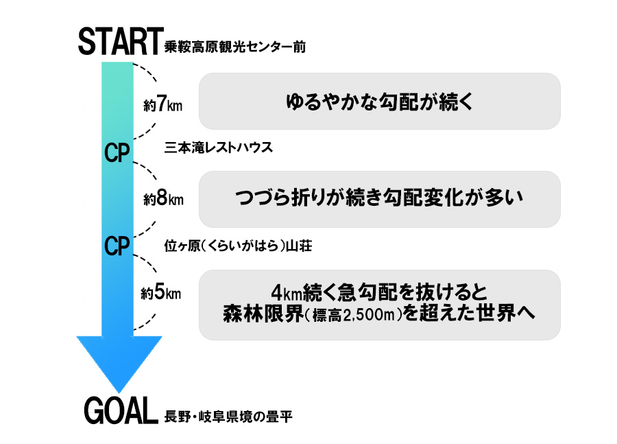 五郎さんは歴代優勝者としてコールされて、スタート地点へ。乗鞍のコースは全長20.5km、標高差は1,260m、平均勾配6.1%。およそ以下のような特徴がある。
