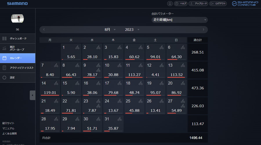 カレンダー画面を見ると走った日が一目瞭然に。走行距離や獲得標高、走行時間などの表示は、右上の「合計パラメーター」から変更できる