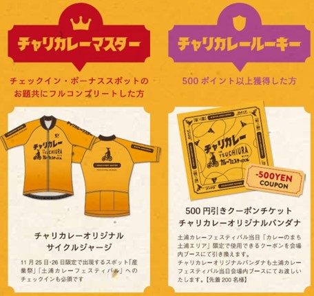 スポットをたくさん回れば回るほど、ポイントを獲得して豪華特典がもらえます。11月25日、26日限定スポット(土浦カレーフェスティバル会場・土浦市産業祭会場)のチェックインでフルコンプリート! 食べて漕いで、目指せ「チャリカレーマスター」!