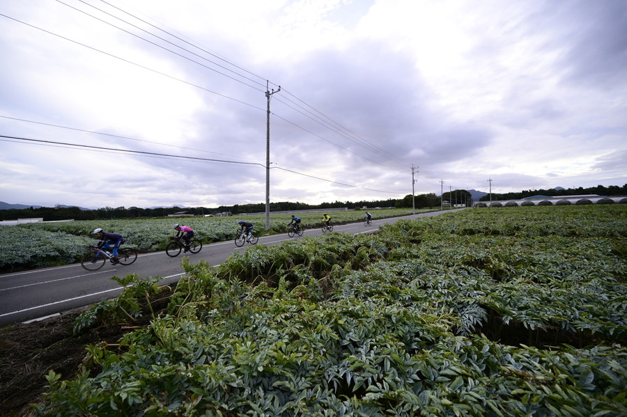 昭和村の朝露光るコンニャク畑の中を抜けてゆく。コンニャクの生産量は群馬県が全国1位、ぶっちぎりの9割シェアを誇っている