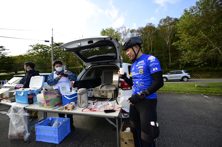 赤城山頂の大沼に作られたエイドで補給するカツアキさんは昨年の3日間10,000UPイベントでも完走。天気はいいが風が強く、そして冷たい