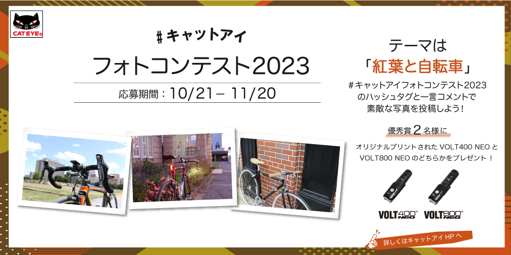 CATEYE(キャットアイ)が期間限定のフォトコンテストを開催中。テーマは「紅葉と自転車」。# キャットアイフォトコンテスト2023のハッシュタグと一言コメントで写真を投稿した人の中から優秀賞(2名)に、オリジナルプリントされたVOLT800 NEOとVOLT400 NEOのどちらかをプレゼント!