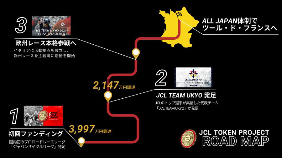 2022年1月に「FiNANCiE」においてプロジェクトを立ち上げて以降、トークン発行型ファンディングにより6,139万円(計2回)の資金調達に成功し、共創型コミュニティーと共に活動してきました。2023年1月には、日本トップクラスの選手が集結した「JCL TEAM UKYO」を発足し、リーグ発足当初からの理念である「日本国籍のチームとして史上初のツール・ド・フランス出場、そして表彰台に登る」という目標に向けて着実に歩みを進めています。