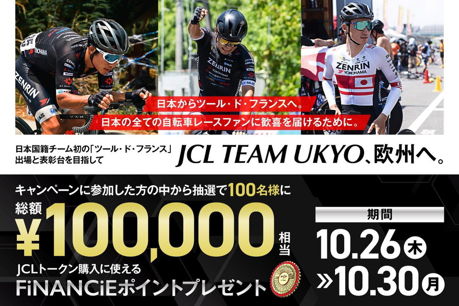 JCLの欧州拠点設立を記念して、JCLトークンの購入に使える「総額100,000円相当」のFiNANCiE ポイントが【抽選で100名さま】に当たるJCL TEAM UKYO応援キャンペーンを実施します。