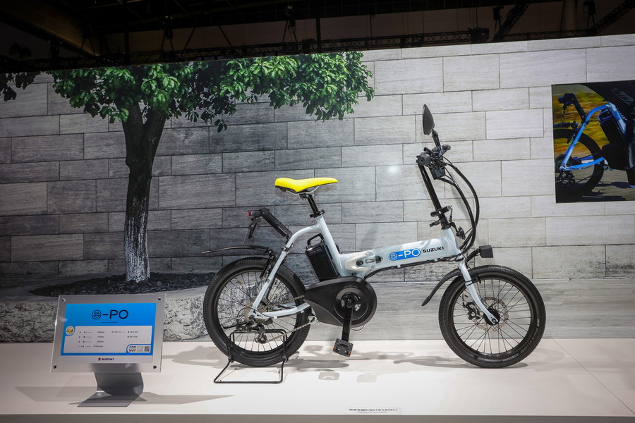 パナソニックサイクルテックからOEM供給を受け電動アシスト自転車を販売するスズキは、同社の折り畳み電動アシスト自転車「オフタイム」をベースにしたモペッド「e-PO(イーポ)」を展示。電動モーターサイクルモードを備えるため、原付1種としての登録が必要となる。