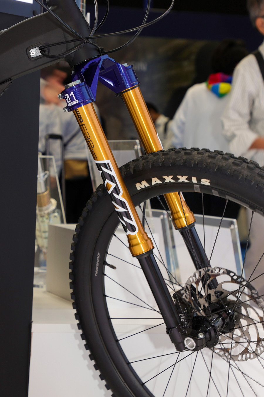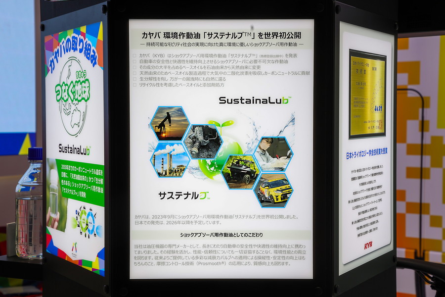 KYBブランドをワールドワイドに展開するカヤバは、ヤマハに採用されたサスフォークの他にも、自社ブースにプロトタイプモデルを装着したYPJ MT-Proを展示。こちらは9月に発表された天然由来のショックアブソーバー用環境作動油「サステナルブ(SastainaLub)」を使用している。