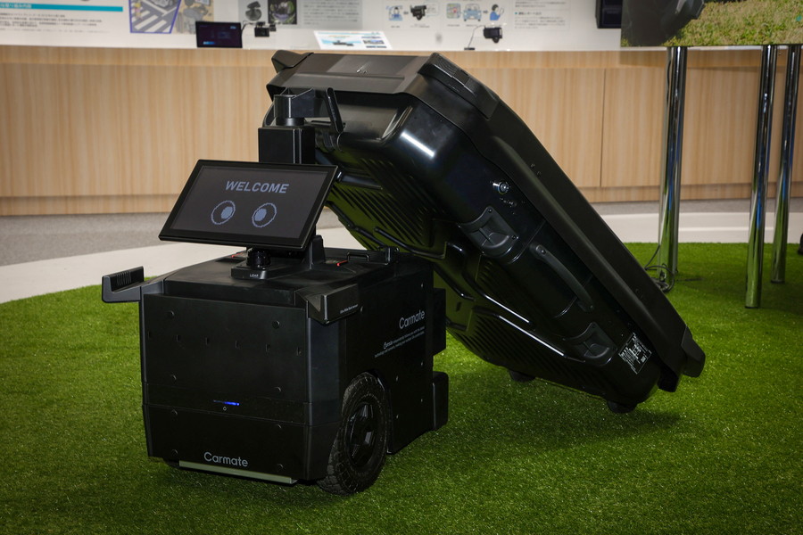 サイクルキャリアやカーアクセサリーでおなじみのカーメイトは、「Carmate Park」というテーマパークスタイルのブースでソーラーパネル付きルーフボックスを牽引してフィールドでの移動を快適にしてくれる、レーダー追尾機能搭載コンシェルジュロボット「キャリオ」を出展。