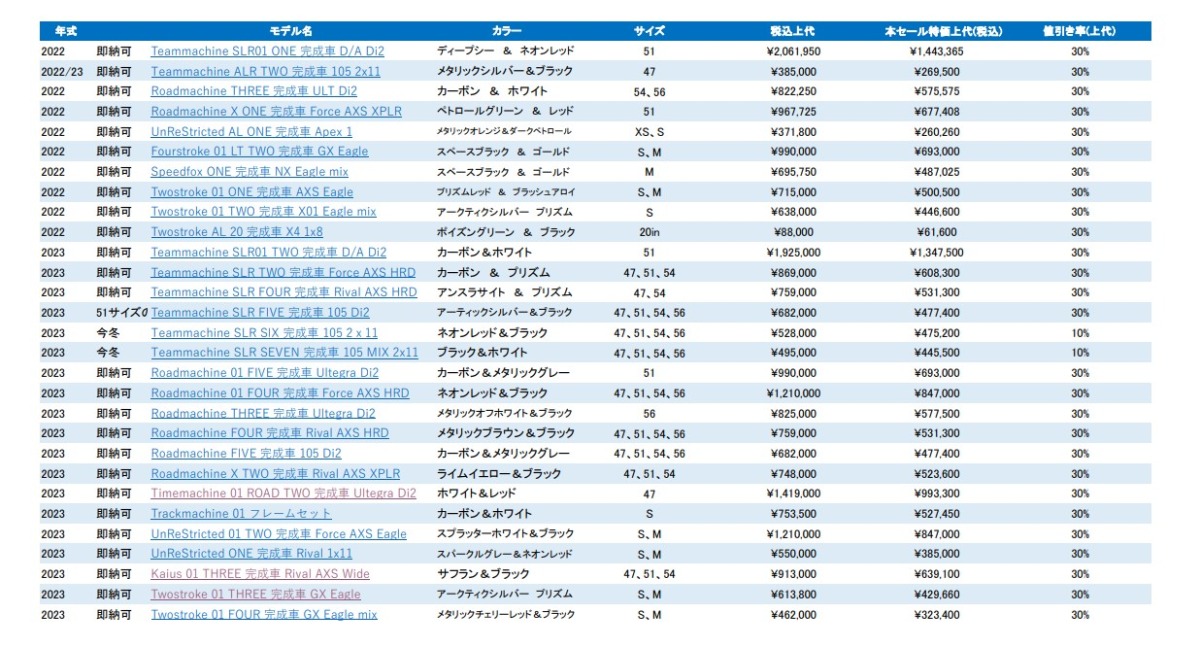 一般ユーザー向けのBMCアウトレットセールを期間限定で開催。サイズがフルで準備できないモデルや旧型コンポ搭載モデルを中心に、アウトレット価格で販売される。