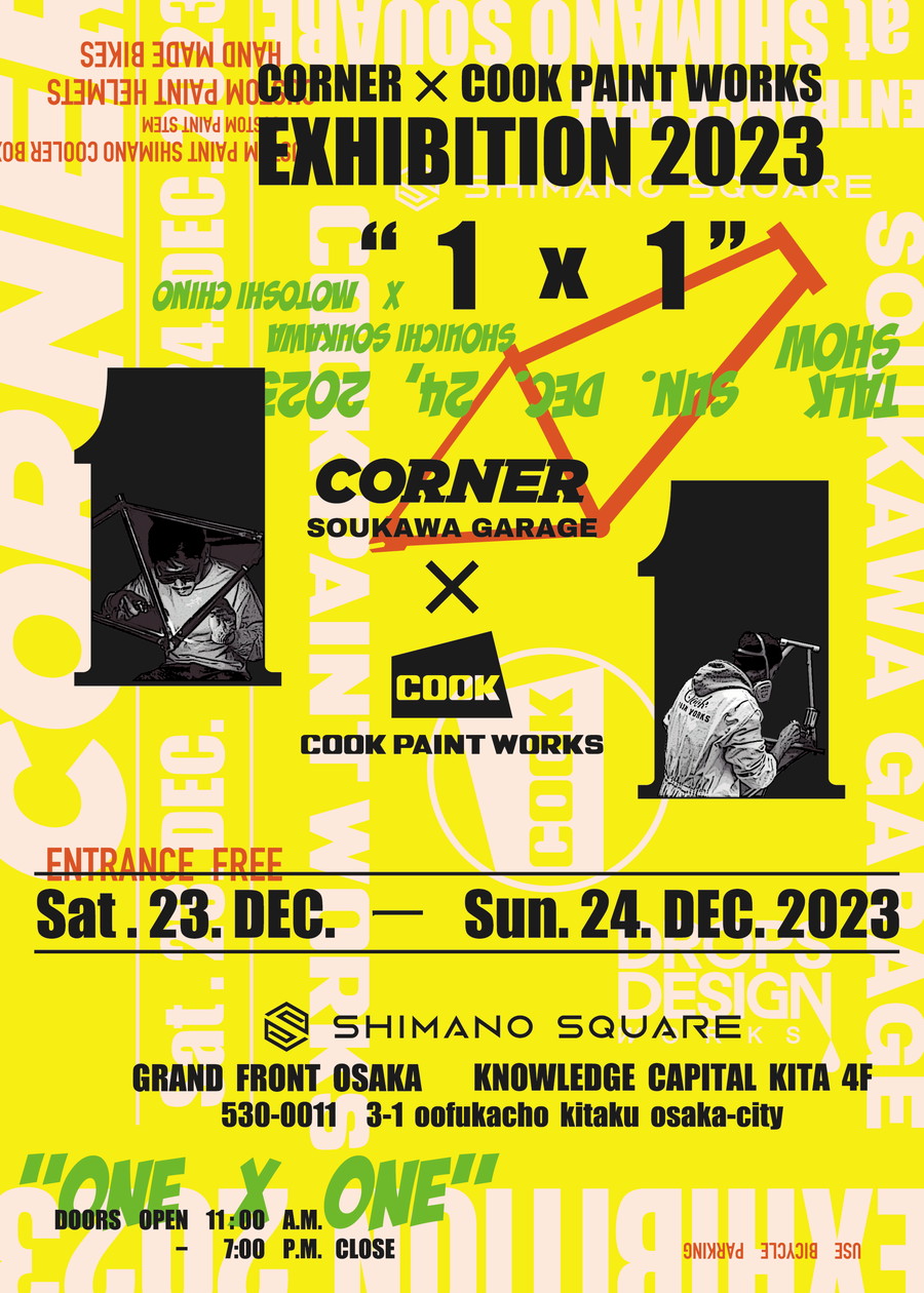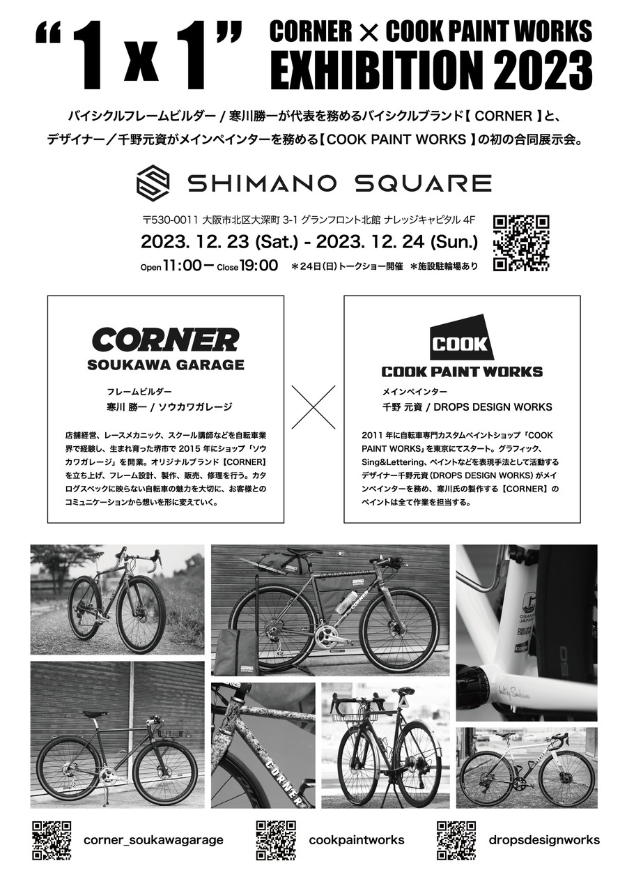 バイシクルフレームビルダー、寒川勝一が代表を務めるバイシクルブランド「CORNER」と、デザイナー、千野元資がメインペインターを務める「COOK PAINT WORKS」の初の合同展示会の開催が決定。期間は12月23日~24日、場所は大阪府大阪市のSHIMANO SQUAREで行われる。以下、プレスリリースより。