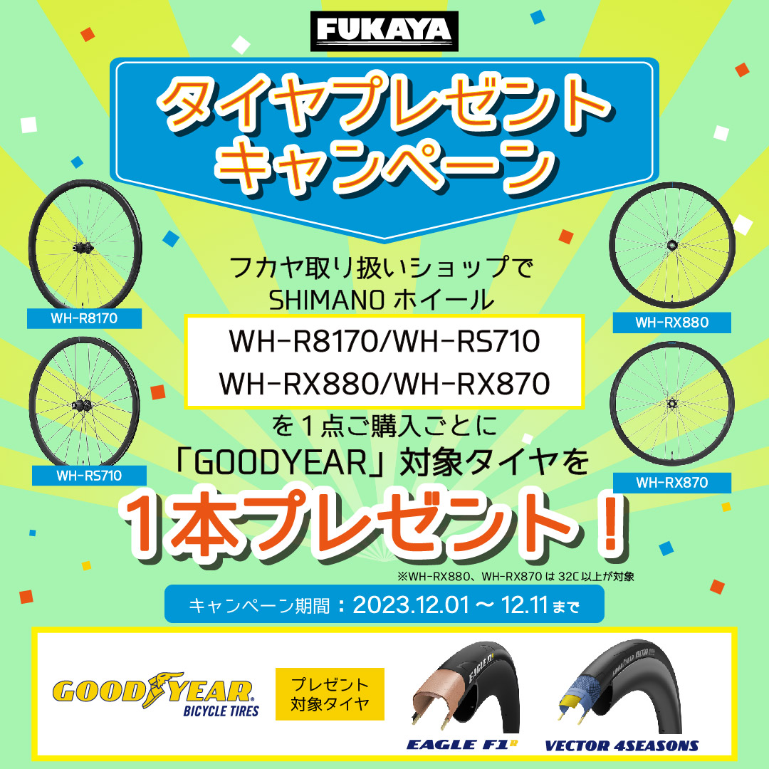 キャンペーン期間中、フカヤ取扱い店舗で対象シマノ製カーボンホイール1点ご購入につき、対象ハイエンドタイヤを1本プレゼントいたします。