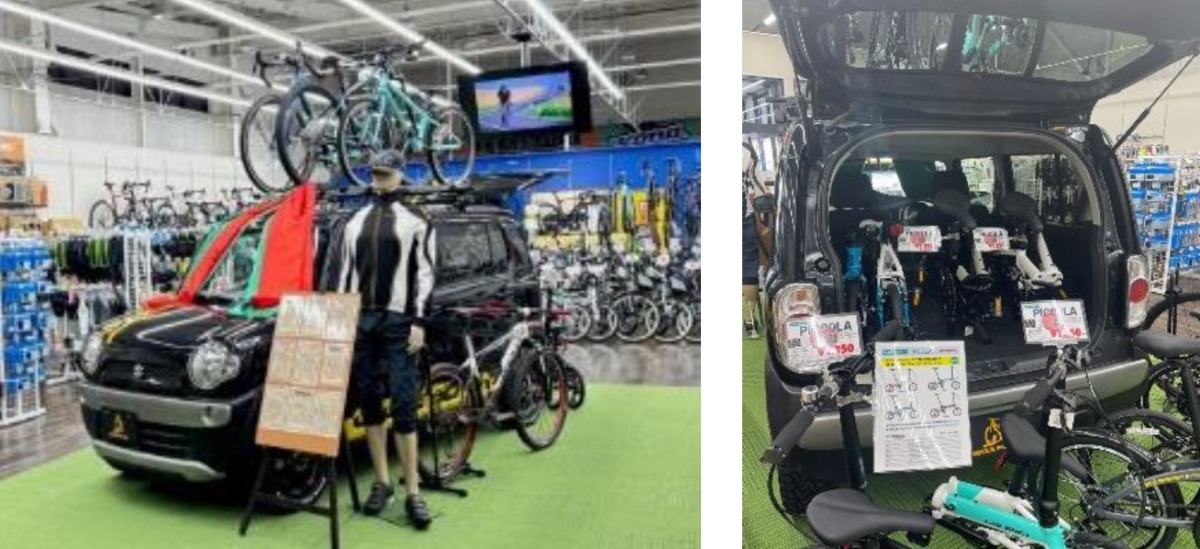 店内の中心には、アウトドアシーンにマッチする『遊べる軽』を置き、上にはスポーツ車が積まれ、トランク側には折りたたみ自転車などがディスプレーされている。見ているだけでもココロオドルだろう。自転車はキッズバイクからハイエンドロードまで約300 台を展示。