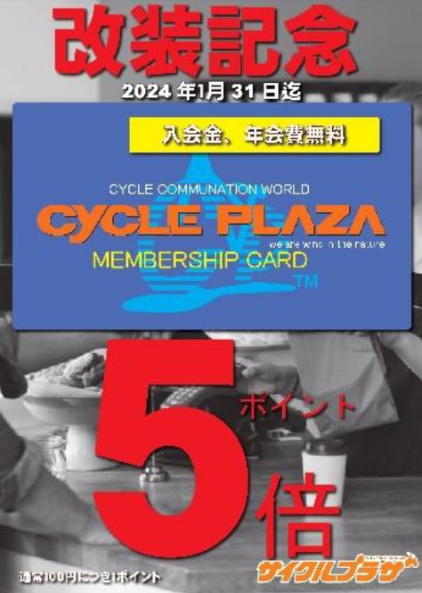 他にも、2024年1月31日まで『プラザポイント5倍キャンペーン』を同時開催。サイクルプラザで使えるプラザポイントを通常の100円1ポイントから100円5ポイント還元となっているので、ぜひお近くにお越しの際は行ってみるのも面白いだろう。