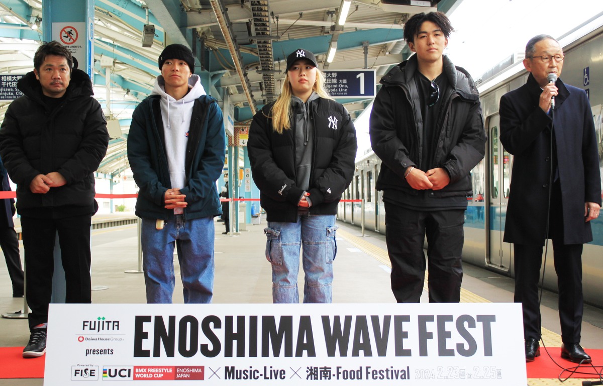神奈川県・江の島エリアで2月23日(金・祝)~ 25日(日)で開催される「 FUJITA Presents ENOSHIMA WAVE FEST(以下EWF)」。これに関連する選手や特別列車のお披露目式が行われた。