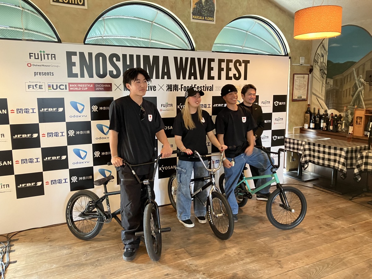2024年1月11日(木)、ENOSHIMA WAVE FEST実行委員会はスポーツ競技による地域活性を目指し 、BMXフリースタイルのワールドカップ「UCI BMX FREESTYLE WORLD CUP ENOSHIMA JAPAN」(以下、BMX大会) を中心としたイベント 「 FUJITA Presents ENOSHIMA WAVE FEST」(以下、EWF)を神奈川県・江の島エリアで2月23日(金・祝)から25日(日)まで地域関係者や企業と共に開催することを発表するとともに、BMX大会出場選手の応援とイベント告知のための特別列車「応援号」のお披露目式を開催地である藤沢市・江の島周辺で行った。